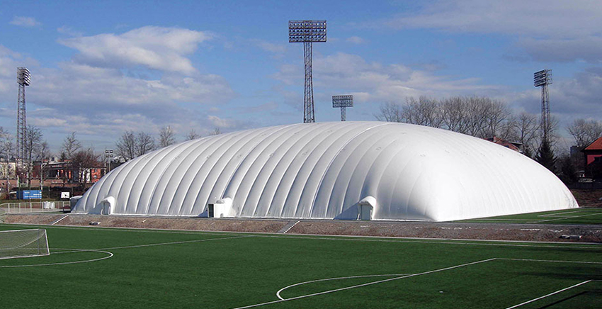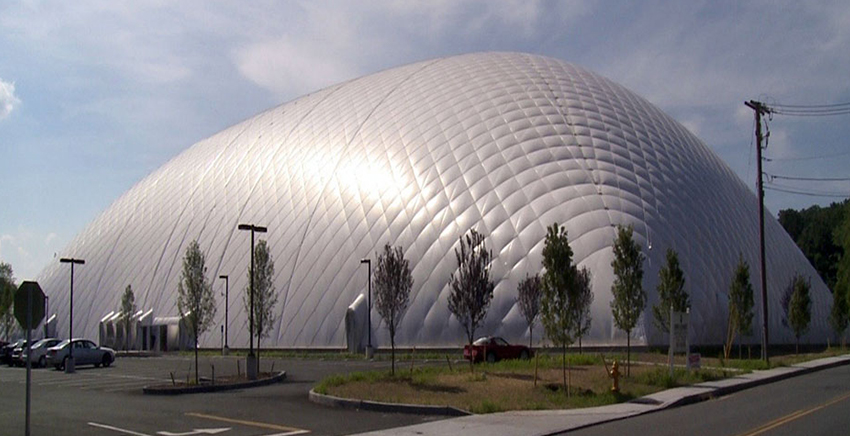 氣膜建筑是用特殊的建筑膜材做外殼,配備一套智能化的機(jī)電設(shè)備在氣膜建筑內(nèi)部提供空氣的正壓把氣膜建筑主體支撐起來的一種建筑結(jié)構(gòu)系統(tǒng)。